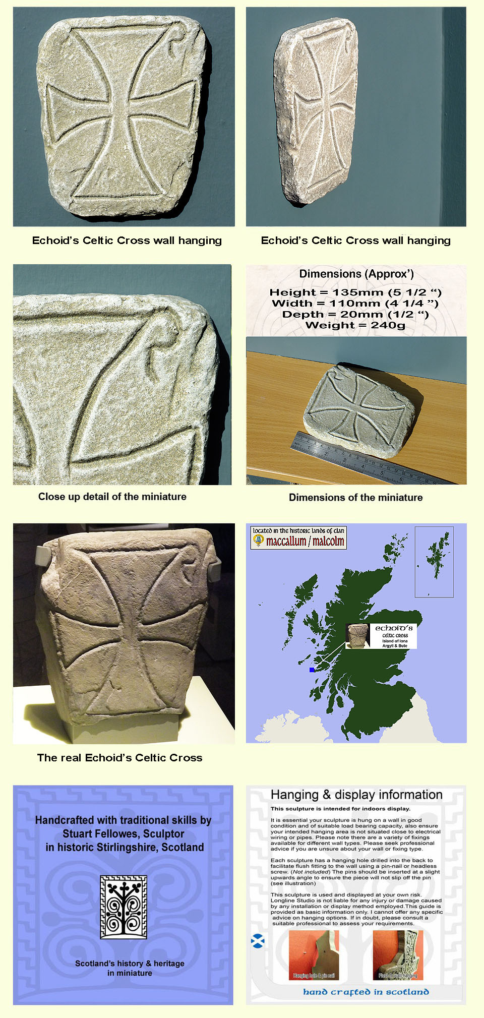 This is a scale artists reconstruction by Stuart Fellowes depicting the 7th century “Lapis Echodi” or Echoid’s stone, Cross and shows how this stone cross would have looked when originally carved. The cross features a Latin style cross with an early Greek Chi-Rho symbol meaning Christ. Today the cross is on display at Iona Abbey