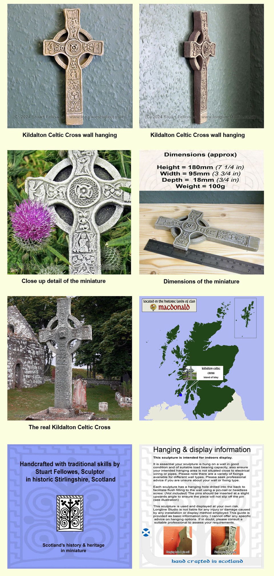 This is a scale artists reconstruction by Stuart Fellowes depicting the 8th century Kildalton Celtic Cross and shows how this epidiorite stone cross may have looked when originally carved. The cross is richly decorated in the “Iona” style of carving and depicts biblical figures and scenes. Today the cross stands at Kildalton Chapel, Islay.