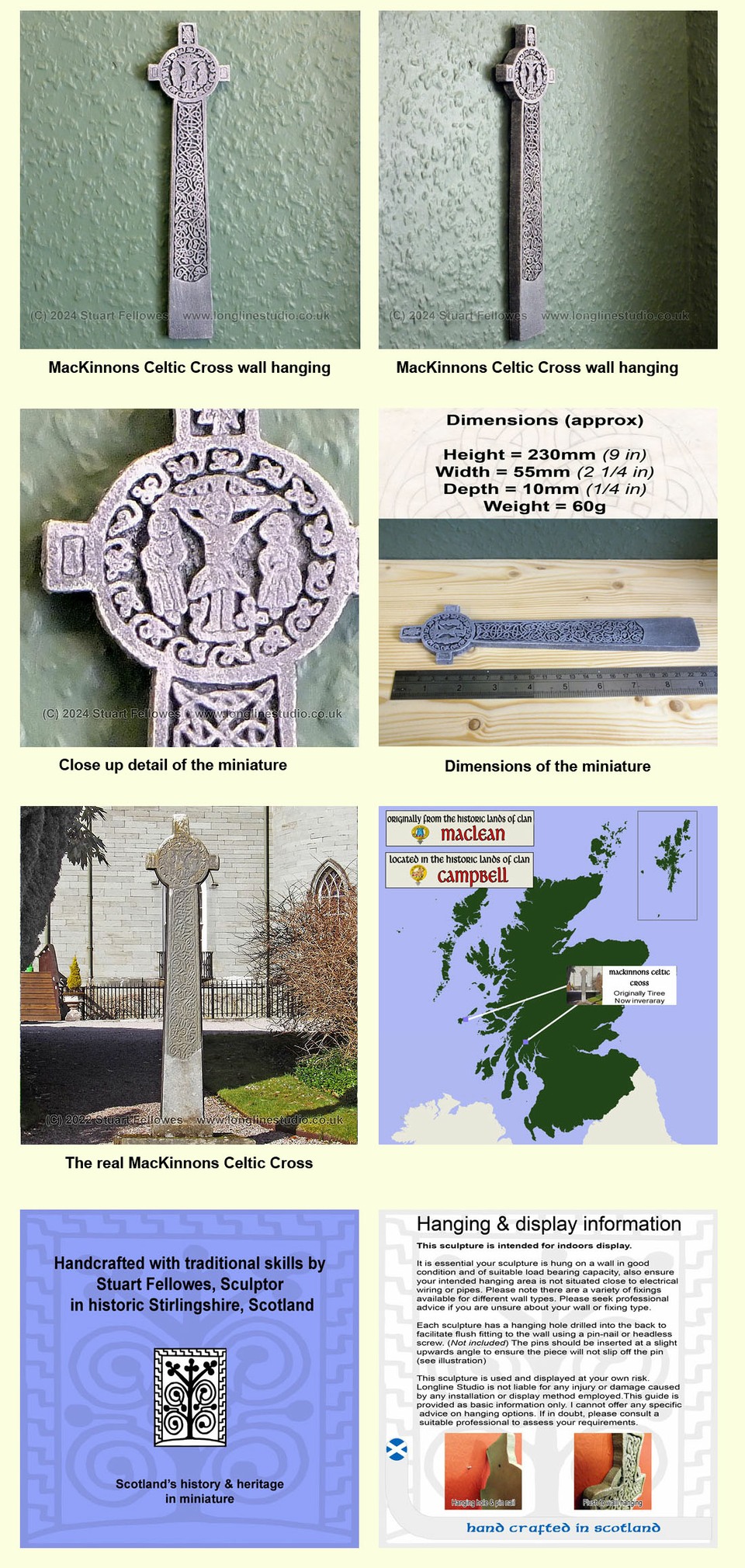 This is a scale artists reconstruction by Stuart Fellowes depicting the 15th century MacKinnons Celtic Cross and shows how this high cross may have looked when originally carved. The cross was dedicated to Finguine MacKinnon who was at one time abbot of Iona and depicts the crucifixion surrounded by foliate carvings. Originally this cross stood at Kirkapol Chapel on Tiree but today the cross stands at Inveraray Castle